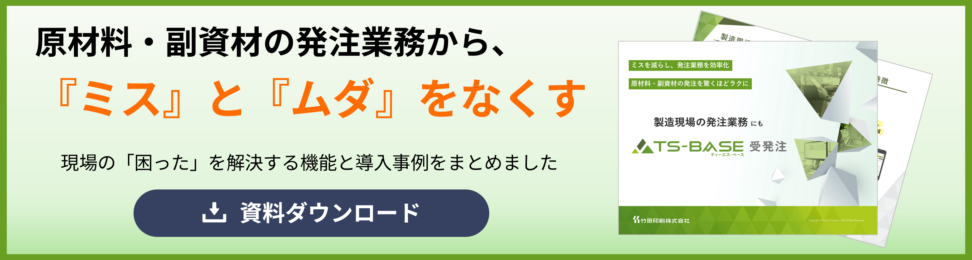 製造業における原材料発注の課題解決には、関係各所のコミュニケーションを円滑にすることが有効です。原材料の定義はさまざまですが、製品が何であれ、「出荷する完成品を製造するために必要な材料」という意味で、欠かせない要素という点は共通です。原材料をとりまく課題は多くありますが、製造現場が担う「受注した製品を納期通りに出荷する」という本来の業務に集中できる環境づくりが何より優先すべきことだと言えます。「TS-BASE 受発注」という受発注管理システムを提供する竹田印刷が、製造業に携わる企業担当者から聞いた話をもとに、原材料に関わる課題と対策の一つ「システム導入のメリット」について解説します。