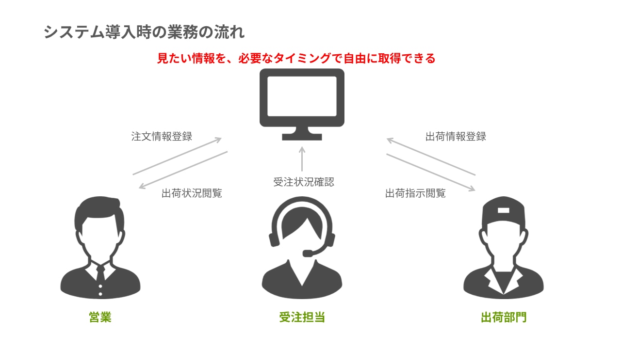 システムを導入したとしても、「在庫情報を注文者に伝える」「受注情報から出荷指示を出す」「出荷部門が納期を提示する」などの他者へ伝える業務は引き続き発生します。しかし、システム導入および一元管理開始前後の大きな変化は「一つの場所へ情報をストックできること」であり、「問い合わせを行う側が情報を選択し、自ら確認できる状況に変わる」ことです。