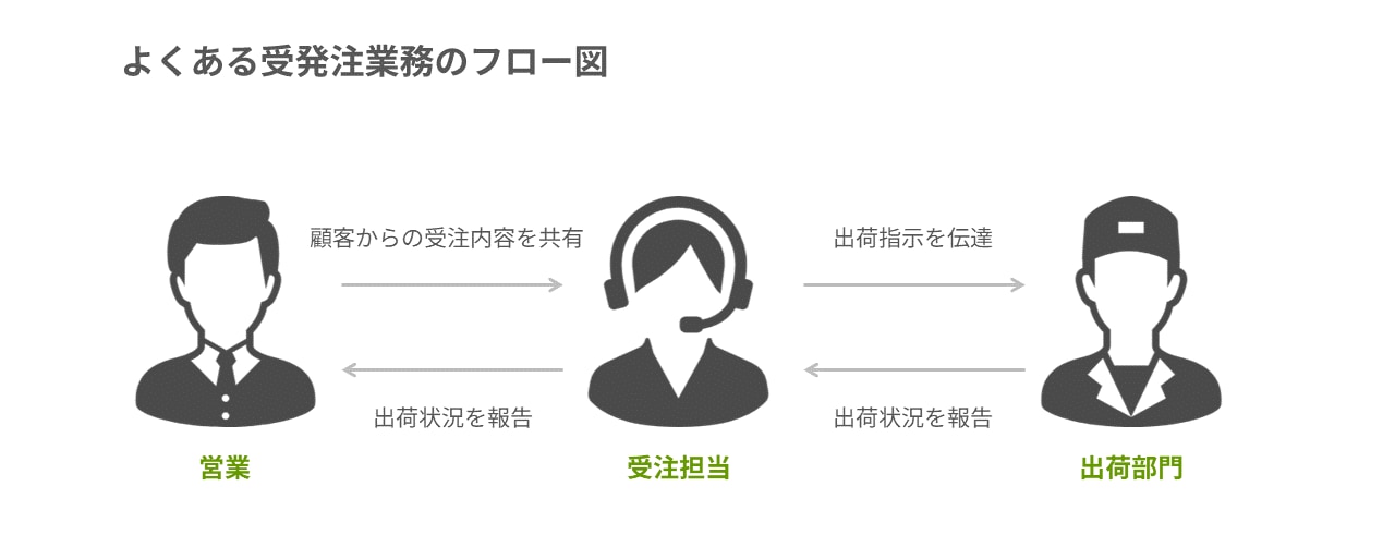 受発注~出荷業務では、「注文を受ける営業」「注文確認を行う受注担当者」「最終的に出荷を行う出荷部門」が連携し、営業(注文者)→受注チーム→出荷チーム→受注チーム→営業…のような情報共有を行いながら進行をしているため、「②受注後の社内調整に時間がかかる」課題を持つ企業も多いです。チームで行う業務は、部署間をまたいでいたとしても一つの仕組みで運用を確立させたほうが効率的になります。