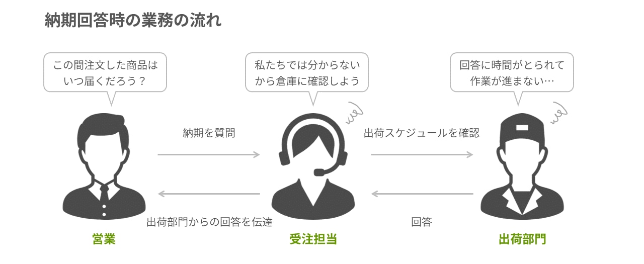 出荷予定は倉庫だけが把握している情報なので、到着日を知りたい注文者は、受注担当者へ問い合わせを行います。そのため、受注担当者は、納期回答を行うために出荷スケジュールの確認を行い、出荷担当者は出荷予定日の回答を行います。「いつ届く?」という一見簡単な質問でも、伝言ゲームのようなやり取りが複数回行われ、各担当者のリソースが積み重なる要因になっているのです。