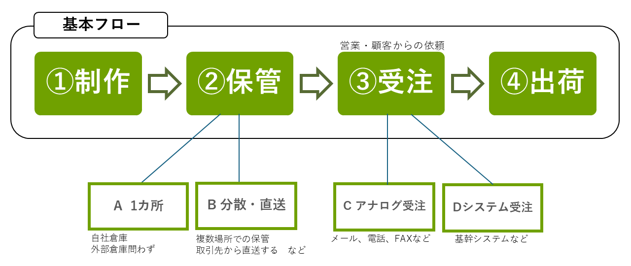 例えば、「販促物を在庫している場合」は、おおむね図解の通りのフローになります。一方で、「受注後に生産を行う場合」で、店舗ごとに在庫保管を行う企業は、スタートの①販促物の企画①から③④②の順で運用が行われているでしょう。ご自身の企業の運用がどのような順を辿っているのか…改めて認識してみると、改善点も探しやすくなります。