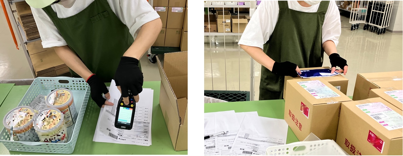 作業③では、Bさんが作業②でセッティングされた注文単位の商品と帳票が正しいかを確認します。TS-BASE 物流では、目視と印字されているバーコードをハンディで読み込み、人力とテクノロジーの両面から正誤の判断を行うようにしています。