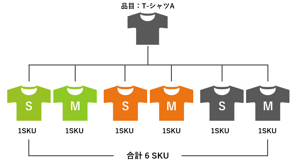「SKU」は、在庫管理を行う単位を明確にして在庫を1カ所に置くというルールにつながっています。SKU(Stock Keeping Unit)とは、品目内の最小単位を意味し、適切な在庫管理には欠かせない単位です。例えば、アパレル商品のTシャツの在庫管理を行う場合、商品アイテム名「A」というTシャツの色展開は3色、サイズはS・Mの2サイズ展開だとします。この場合、品目AというTシャツは6SKUある在庫品ということになります。