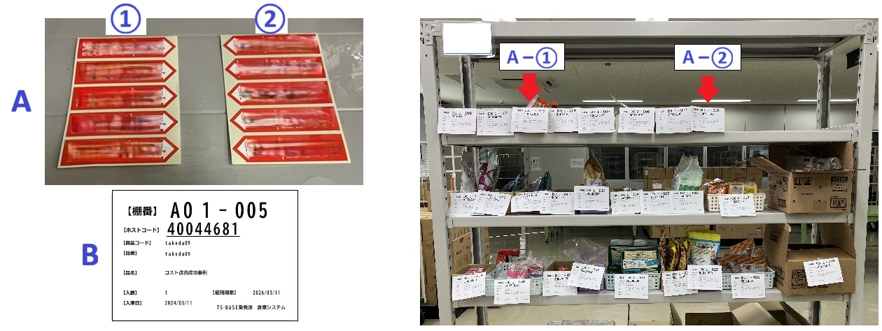 このような手間が起きないためにも、品目にはこだわらずSKU単位で棚に置くことを推奨しています。上記の写真を例にご説明します。向かって左上(A)のように、見た目が類似している同品目の在庫品は、A-①・A-②のようにSKUごとに管理コードを決め、それぞれ別商品扱いで在庫管理を行います。在庫棚へ置く際は、棚番(在庫場所を示す住所のような番号)が記載された紙を確認しやすい場所へ貼り、管理する棚へ置きます。赤矢印のようにA-①・A-②をあえて離れた場所へ置くと、入出荷のミス防止に効果的です。これは、省スペースでも工夫できる在庫方法の一つだと言えるでしょう。