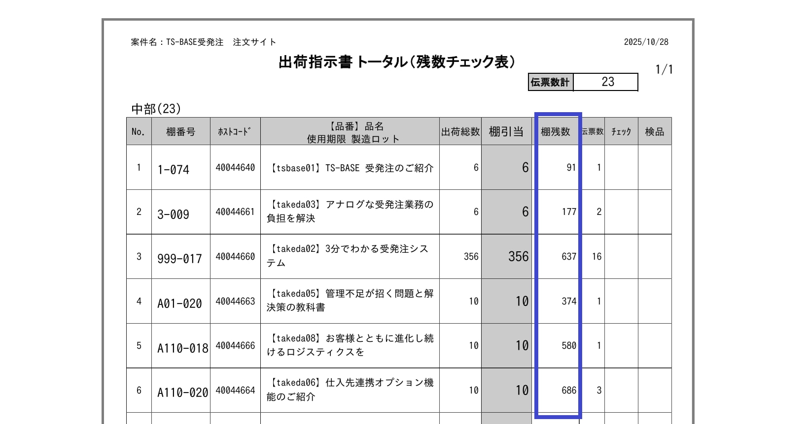 注釈:TS-BASE 受発注から出力可能な出荷指示書例。青四角部分「棚残数」が、棚引当数量をピッキングした後に残る残数を意味します。