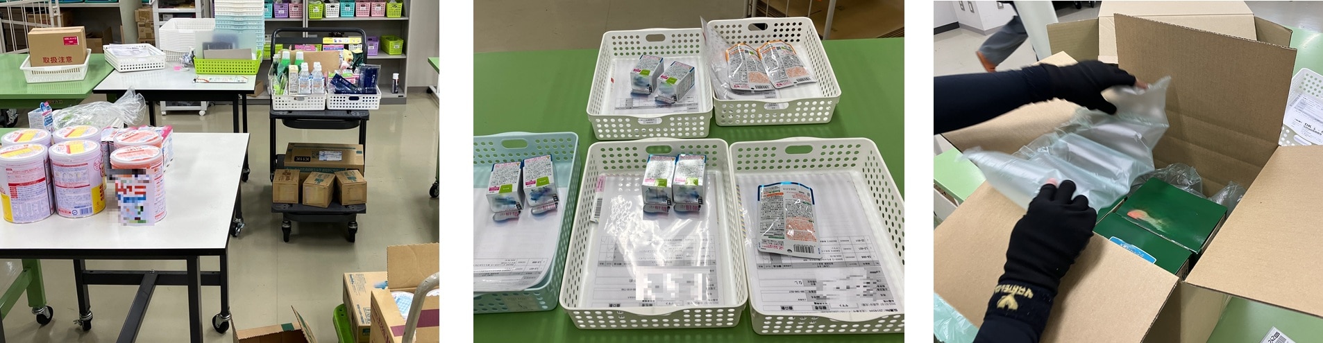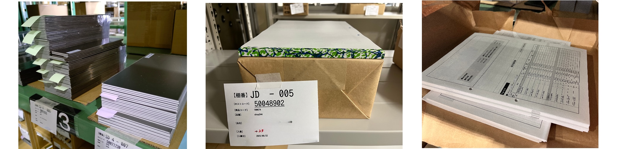注釈:向かって左:一定数ごと付箋を入れて管理。中央:入荷した梱包形式を生かした管理。向かって右:一定数ごと互い違いに重ねた管理。