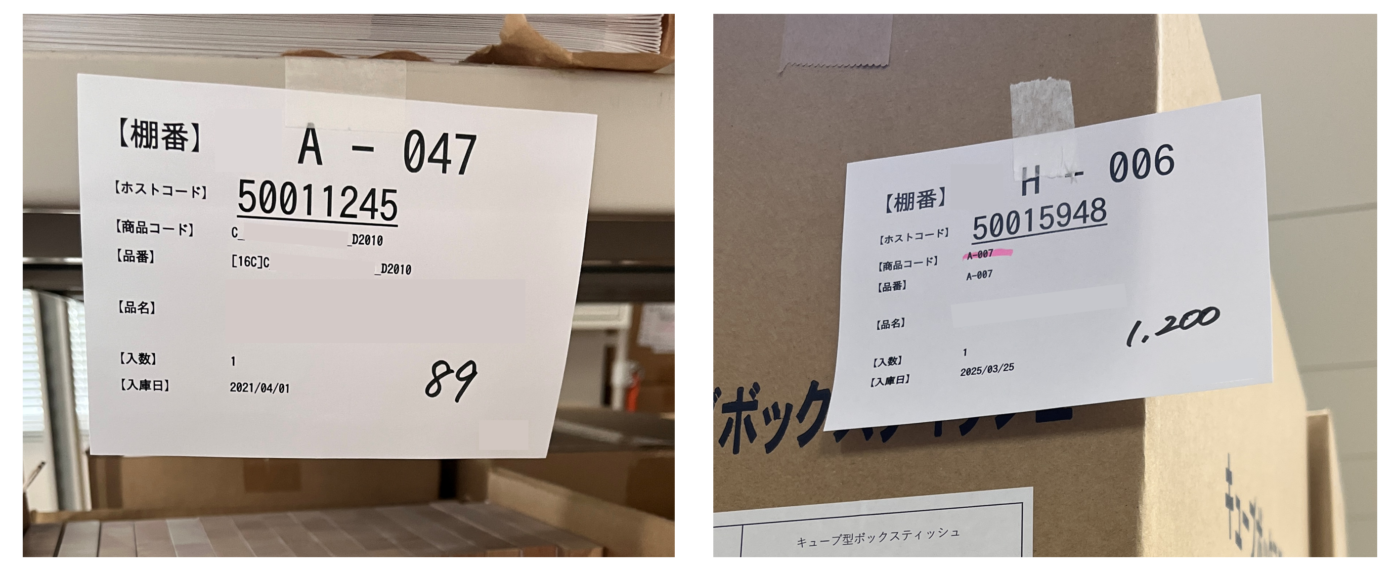 注釈:棚や段ボールに棚札を掲示し、何がどこにあるのかを把握できる状態に。棚札とは、棚やラックに貼り付ける在庫管理用ラベルで、「棚番」「商品コード」「品番」など、ピッキングに必要な情報が記載されています。