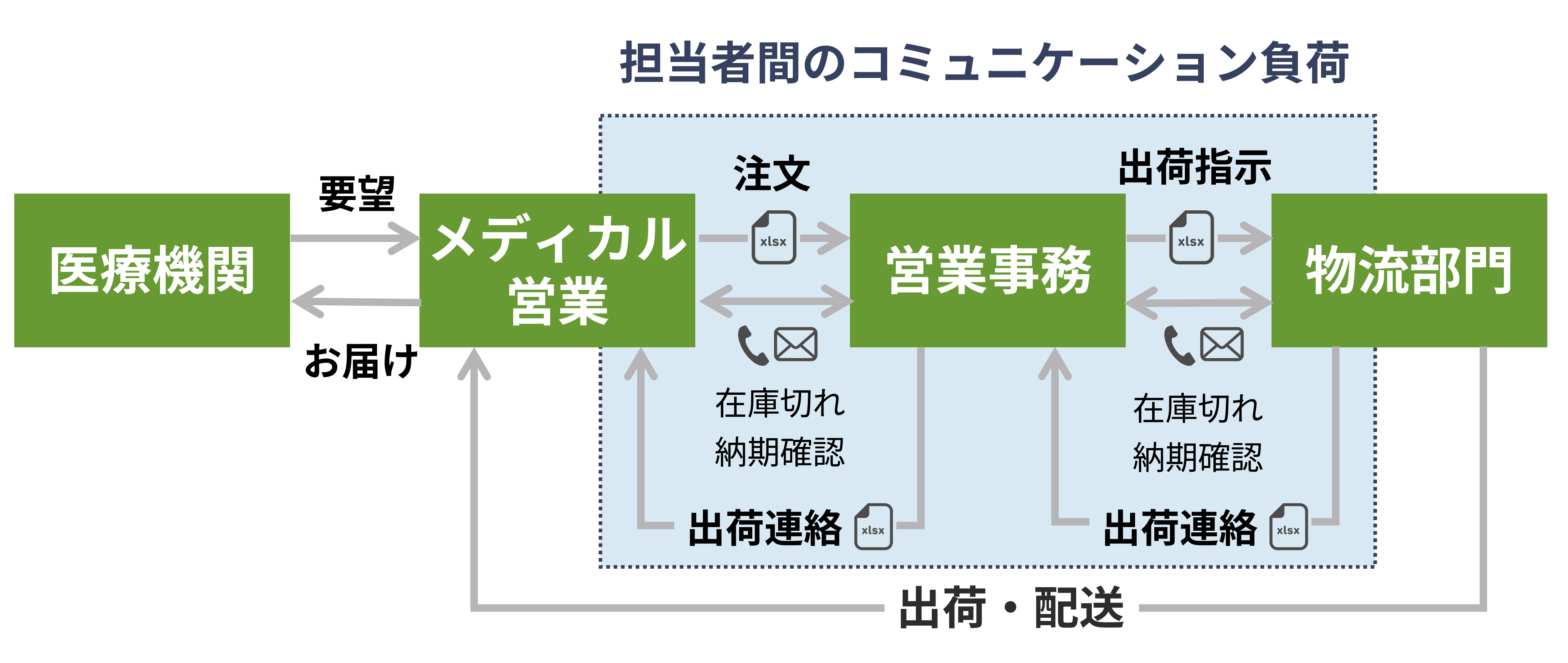 これらの各工程の作業工数と時間を考慮し、「週2回」という注文の締め日が設けられていました。このため、メディカル営業が注文をするタイミングによっては、注文してから到着するまで1週間以上かかるケースもあり、顧客をお待たせする状況が生まれていました。