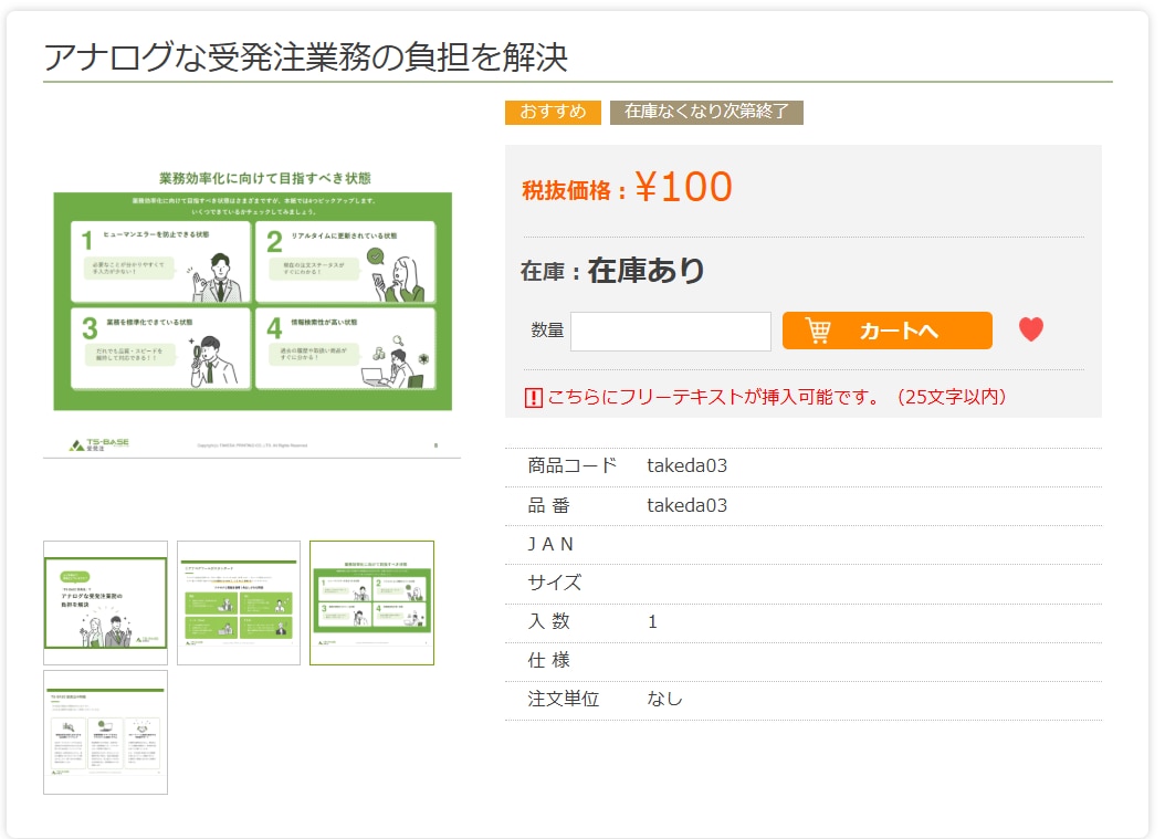 注釈:TS-BASE 受発注 注文サイトの商品詳細ページの観覧イメージ。