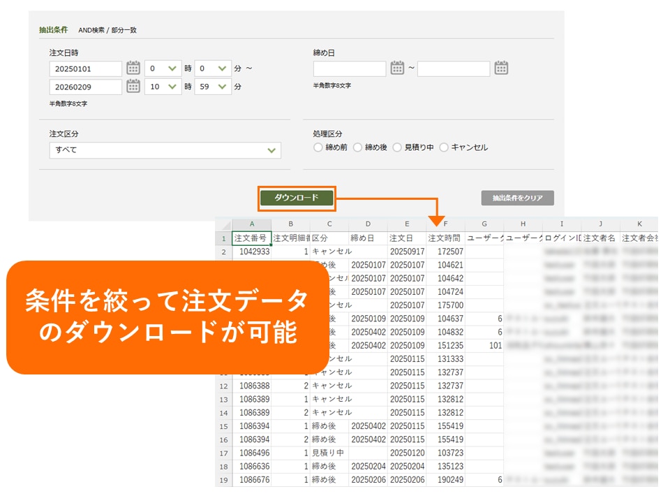 注文データ出力では、注文サイトを通じて蓄積した受注情報をCSV形式でダウンロードをすることができます。注文日時や注文の処理区分などの条件で絞り込み、注文者情報・送付先情報・商品情報・注文金額などの詳細なデータを確認することができます。