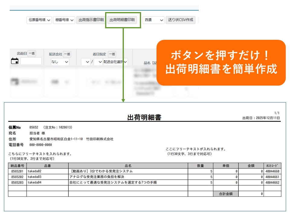 出荷明細書作成とは、商品発送時に同梱する出荷明細書をシステムから自動生成できる機能です。出荷明細書は金額表示のある/なしの2フォーマットから選択でき、挨拶文や荷主情報を自由にテンプレート設定することができます。