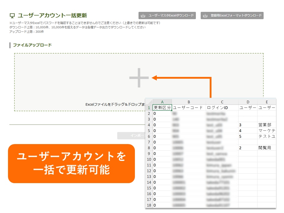 登録済みのユーザーアカウントマスタを出力し、更新区分を設定して再アップロードすることで、既存情報を保持したまま必要な項目のみを効率的に更新できます。なお、パスワードは暗号化されているため出力データに反映されません。