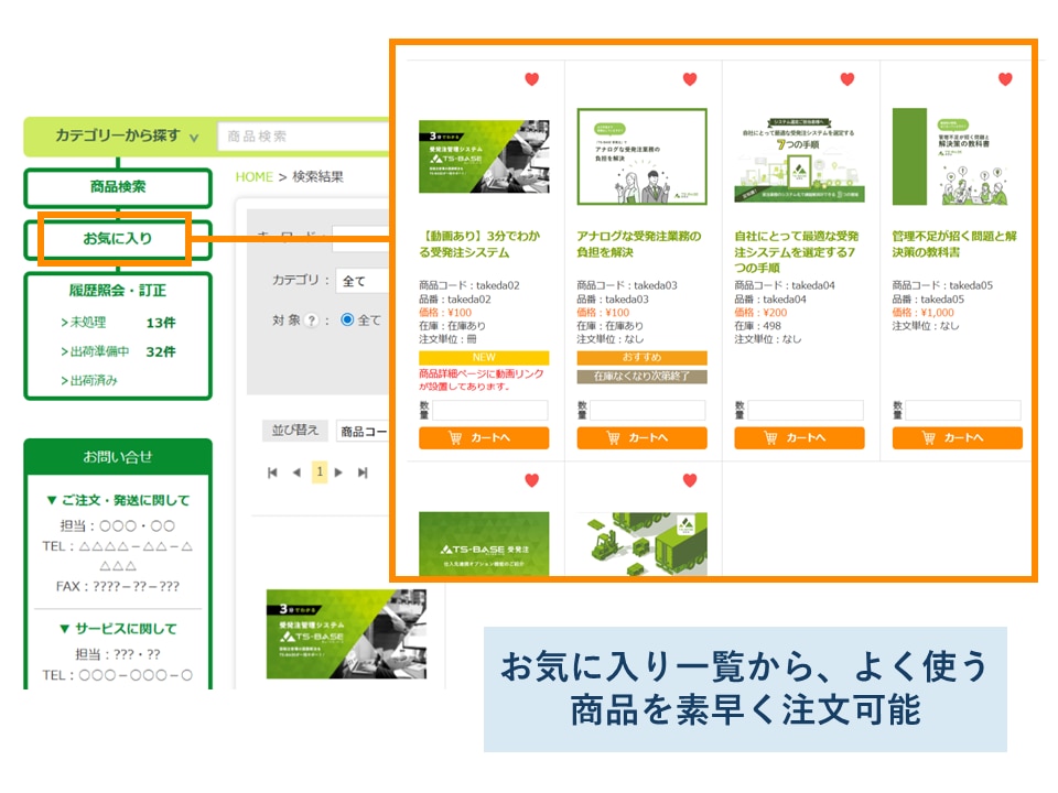 登録したお気に入り商品はサイドメニューから一覧(お気に入り一覧)でいつでも確認可能。お気に入り一覧では注文数量を数字で入力するだけでまとめてカートに移動ができるため、注文・発注業務の効率化につながります。